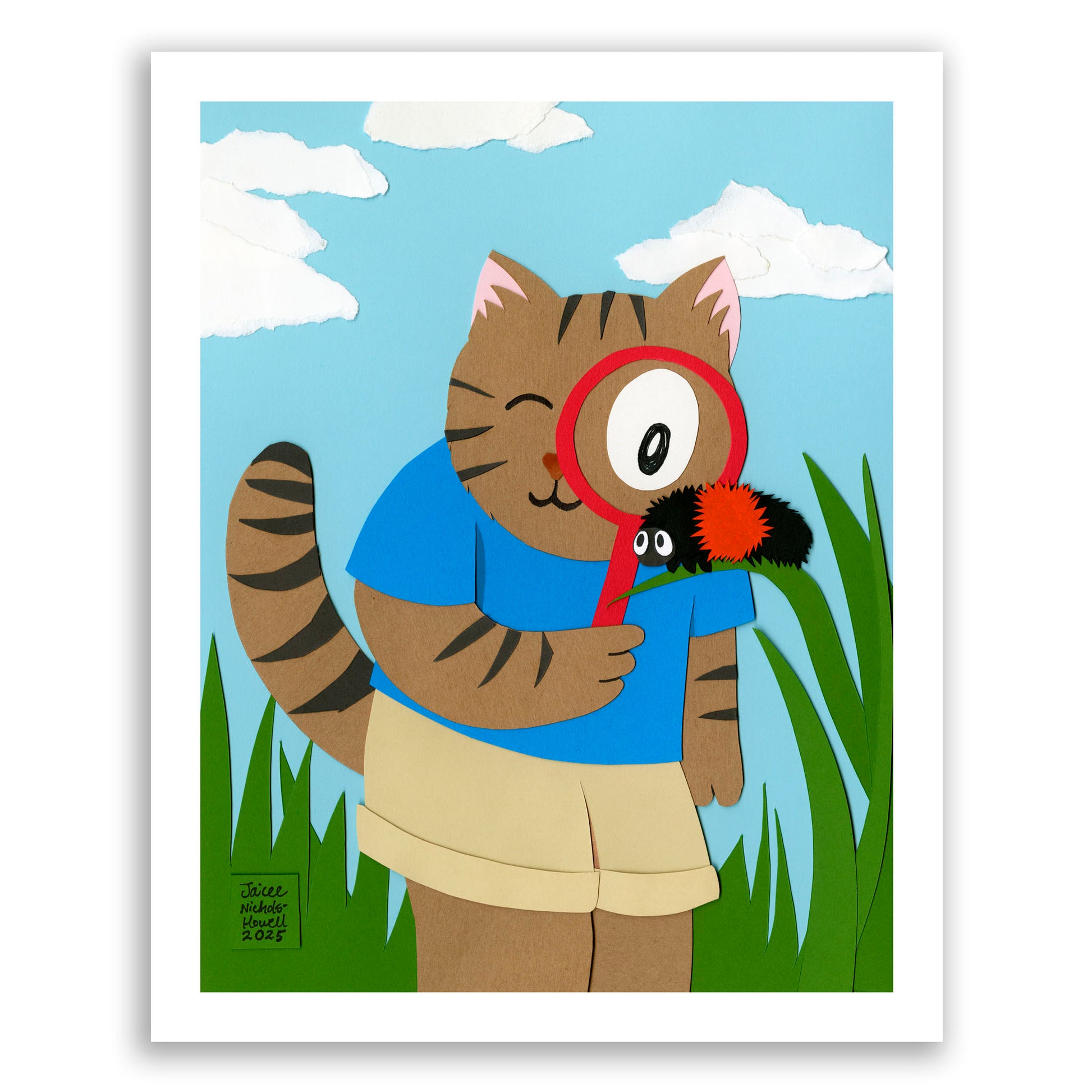 This curious cat pauses to examine a woolly bear caterpillar, inviting little explorers to step outside and discover the wonders waiting just beyond their door.