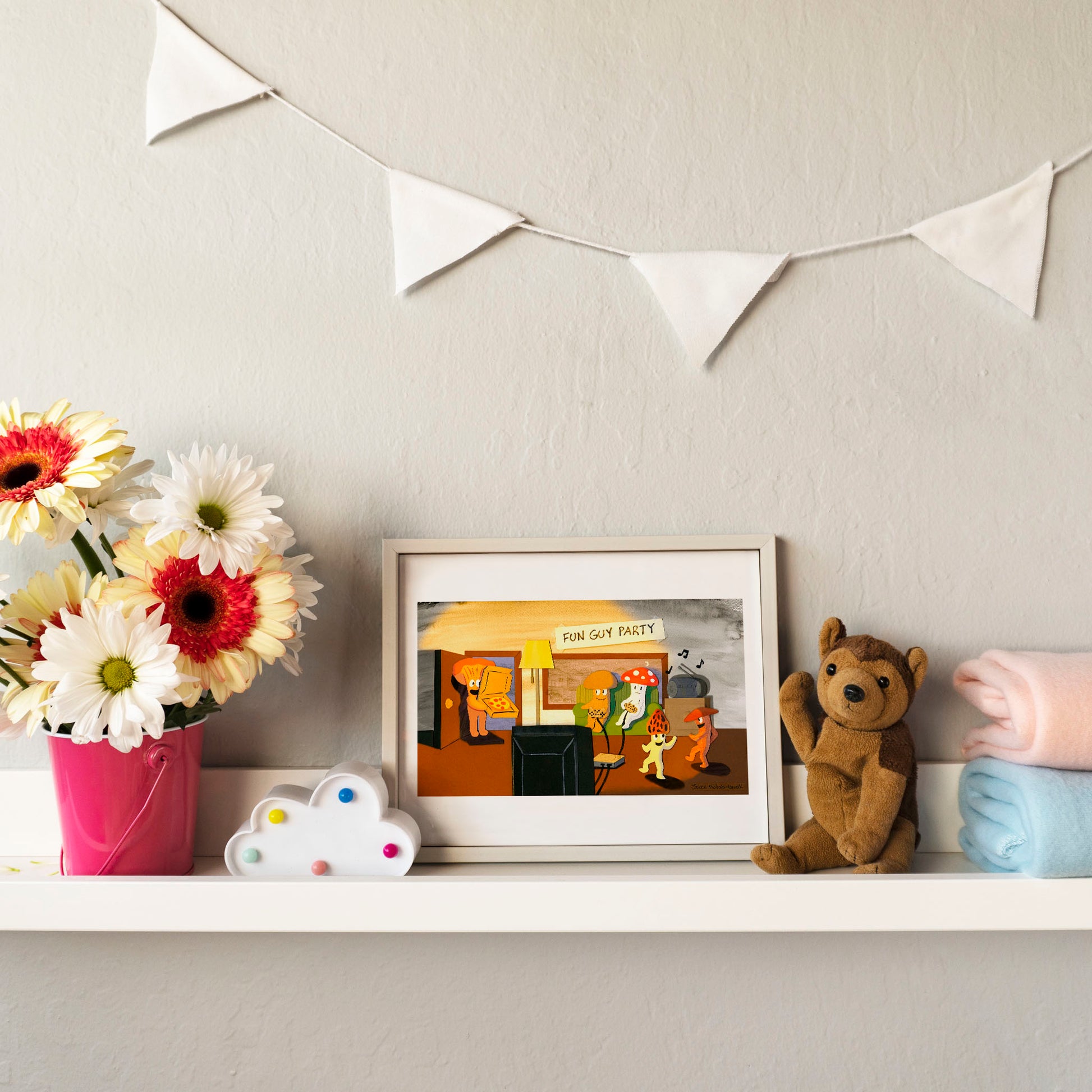 These playful mushroom characters are having a blast playing video games, dancing, and indulging in some delicious pizza, and you're invited to the party!