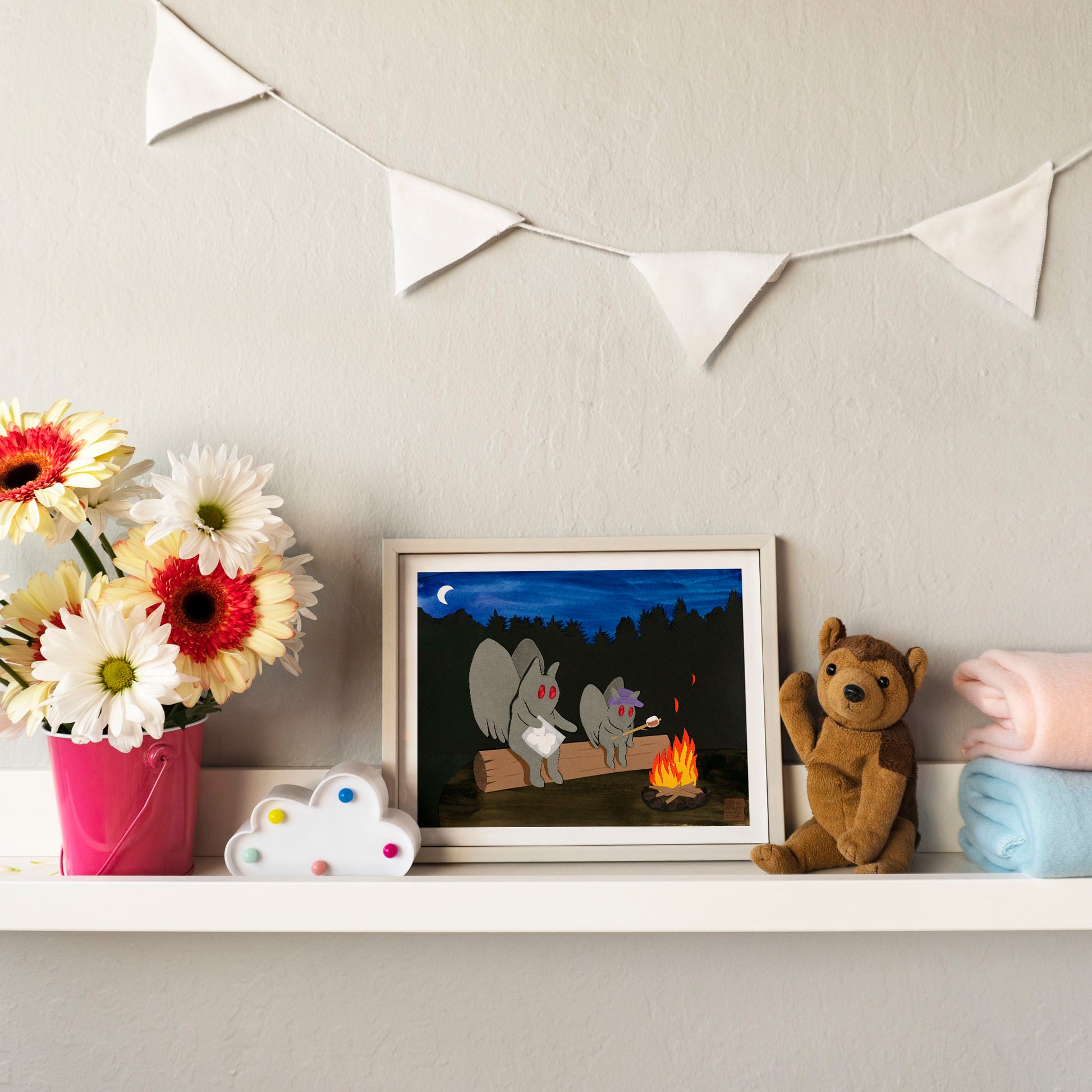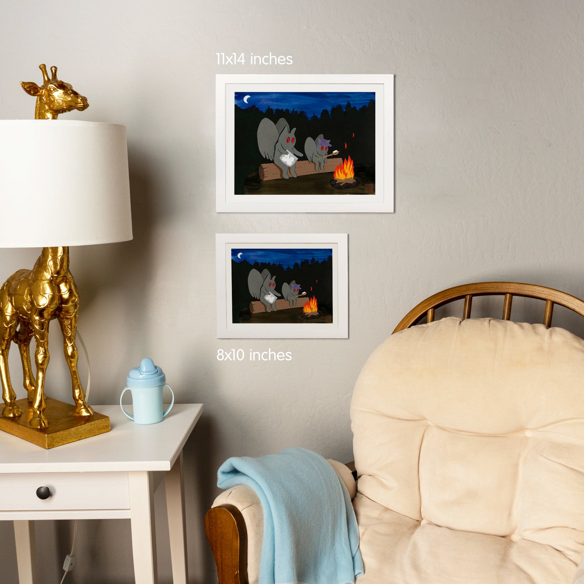 Gather around the campfire with Mothman and his child as they bond over roasting marshmallows under a beautiful moonlit sky.